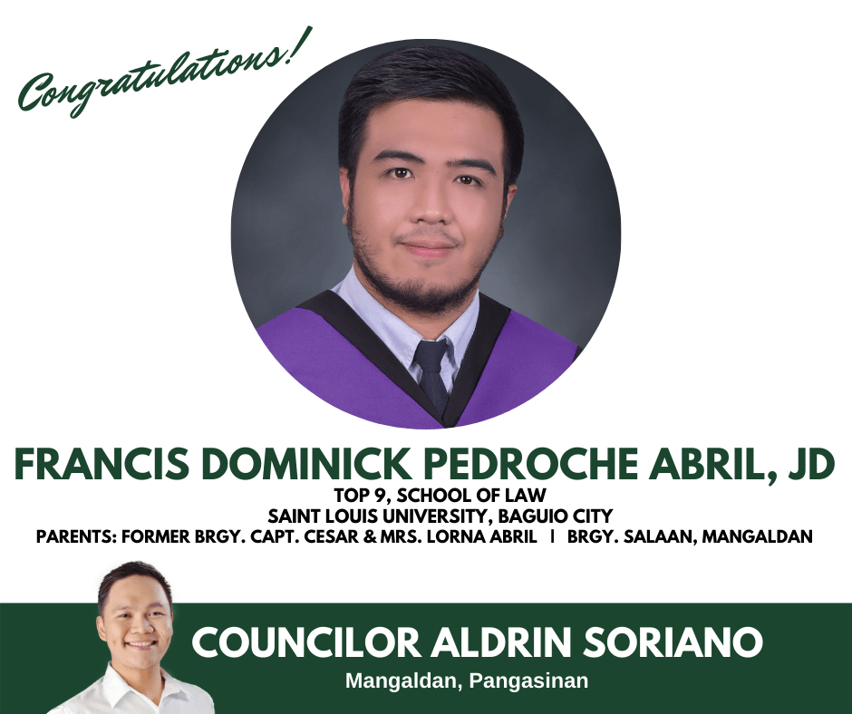 Twenty-four year old Francis Dominic Pedroche Abril of Barangay Salaan, Mangaldan has ranked 9th in the graduating batch of the School of Law of Saint Louis University in Baguio City.