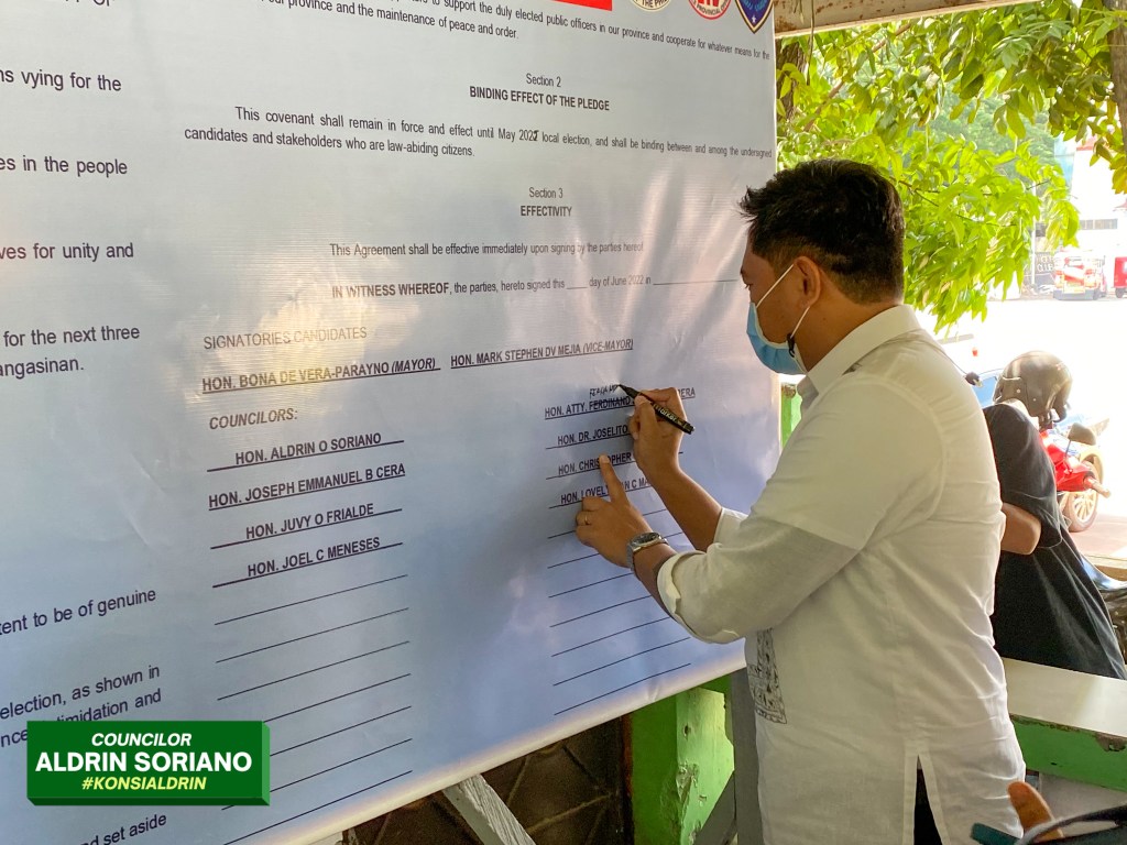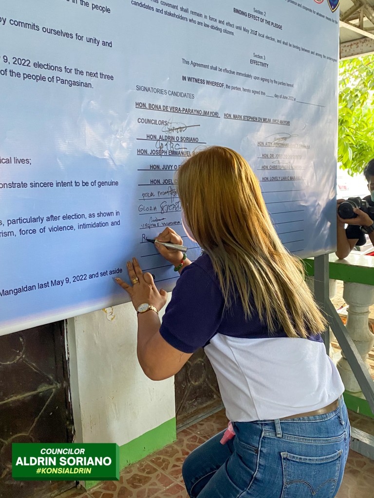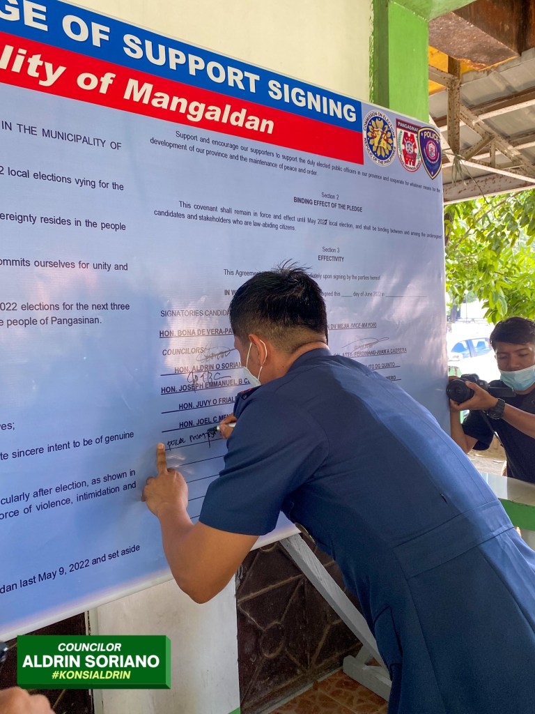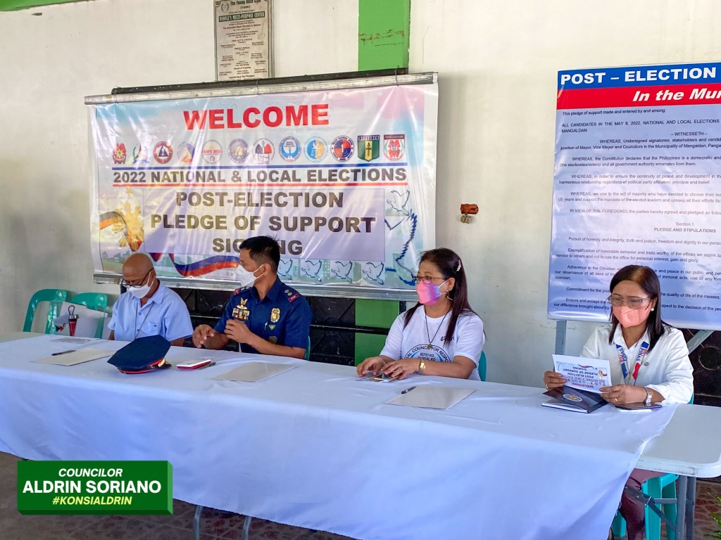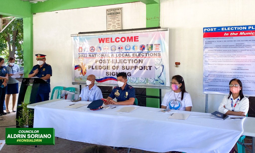 Dinaluhan ng ilang mga nanalong kandidato sa Halalan 2022 sa Bayan ng Mangaldan ang isang pledge of support sa Philippine National Police Mangaldan Police Station, Lunes June 13 o mahigit isang buwan pagkatapos ng eleksyon.